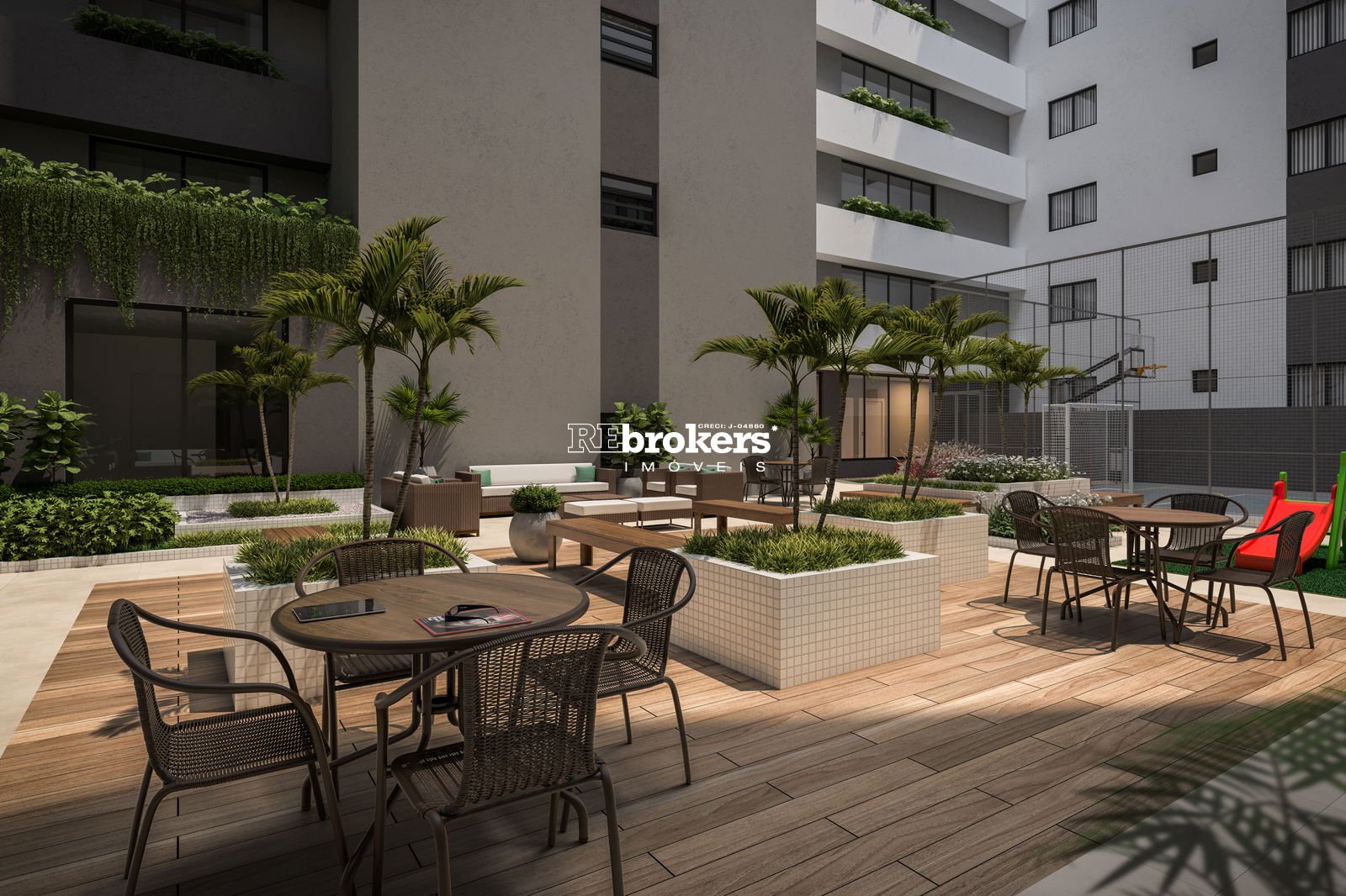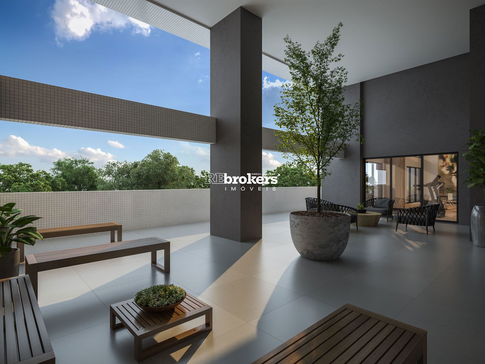 Praça externa com paisagismo