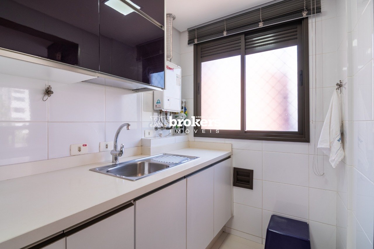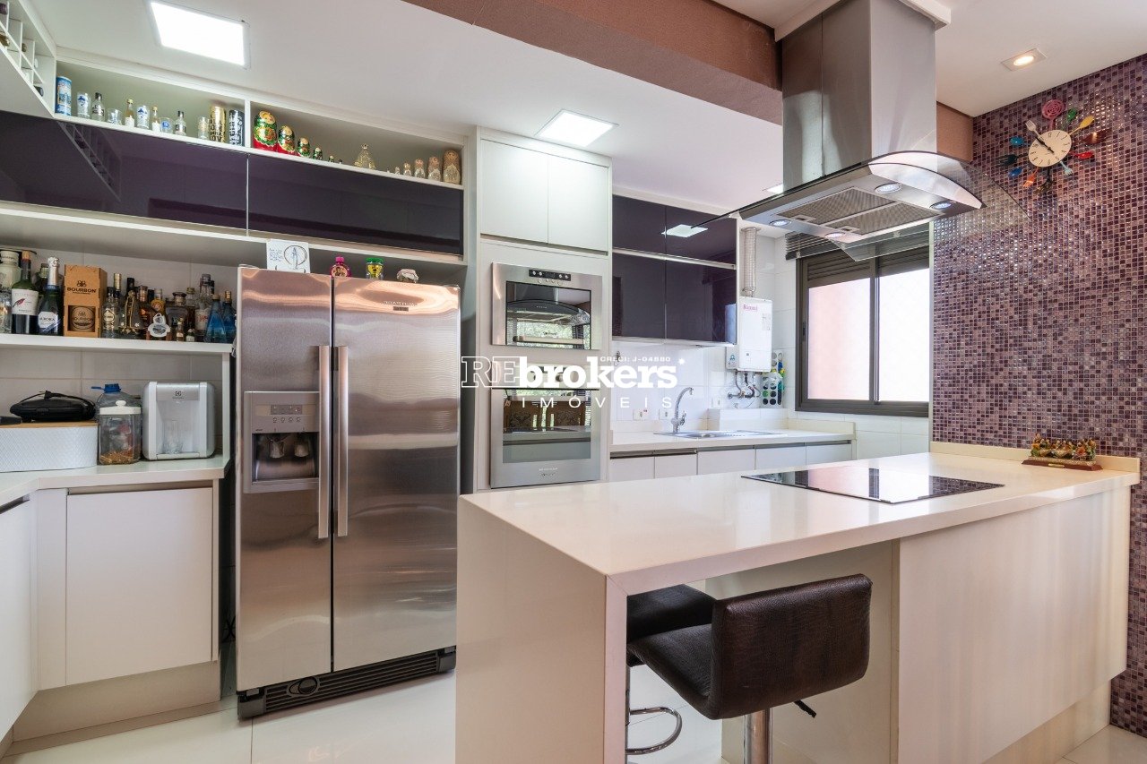 - Cozinha em estilo americano com armários planejados e integrada à área social;